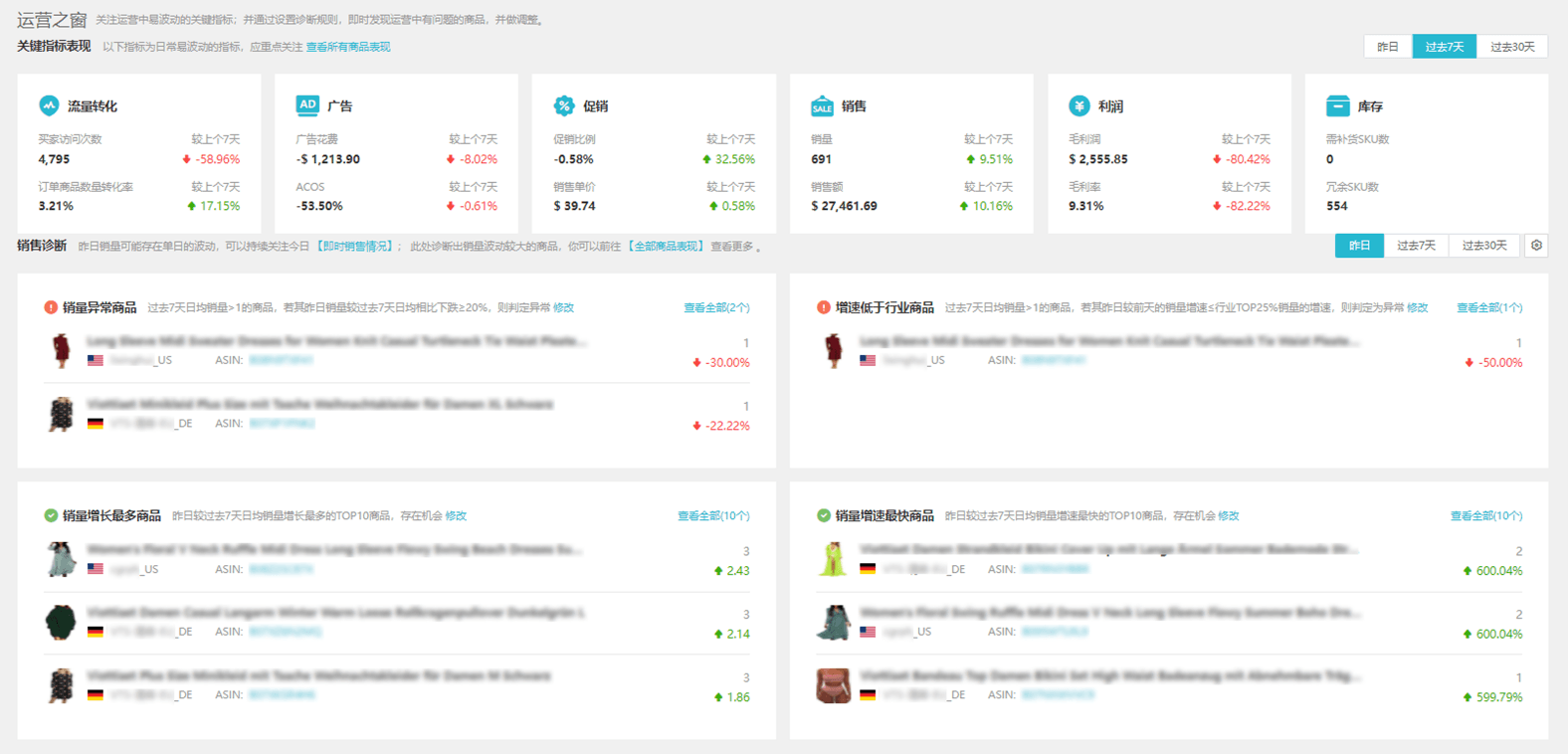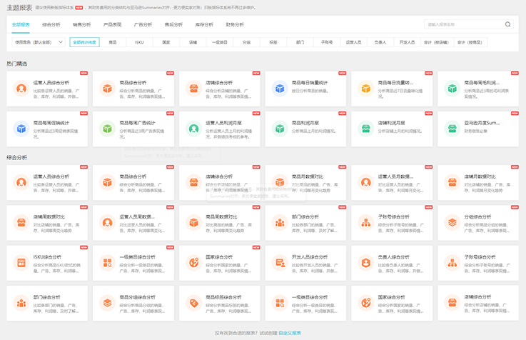 綜合分析、廣告分析、產(chan) 品表現、銷售分析、售後分析、財務分析、庫存分析